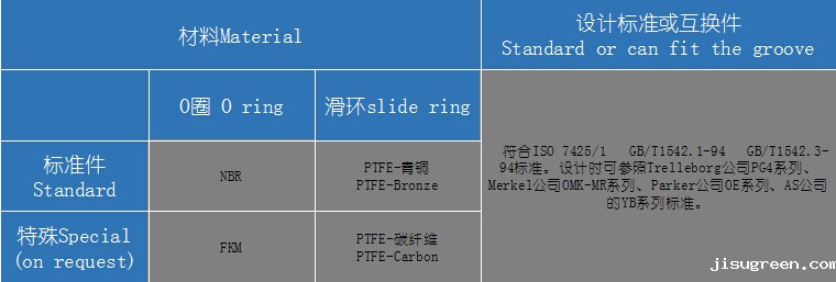 孔用格莱圈 孔用格莱圈 代码 压力≤(MPa) ≦60 MPa 温度℃ -45℃~+200℃ 速度≤(m/s) ≦15M/S 介质 油、空气和水 材料 NBR、PTFE 、FKM 适用 液压设备、标准油缸 备注